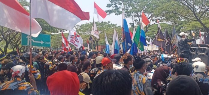 Kabupaten Bekasi – Enam belas organisasi masyarakat menggelar aksi demontrasi di kawasan industri GIIC, Cikarang Pusat Kabupaten Bekasi, Selasa, 12 Oktober 2021. Aksi yang dimulai sejak pukul 07.00 wib berhasil dibubarkan polisi pada pukul 11.00 wib.