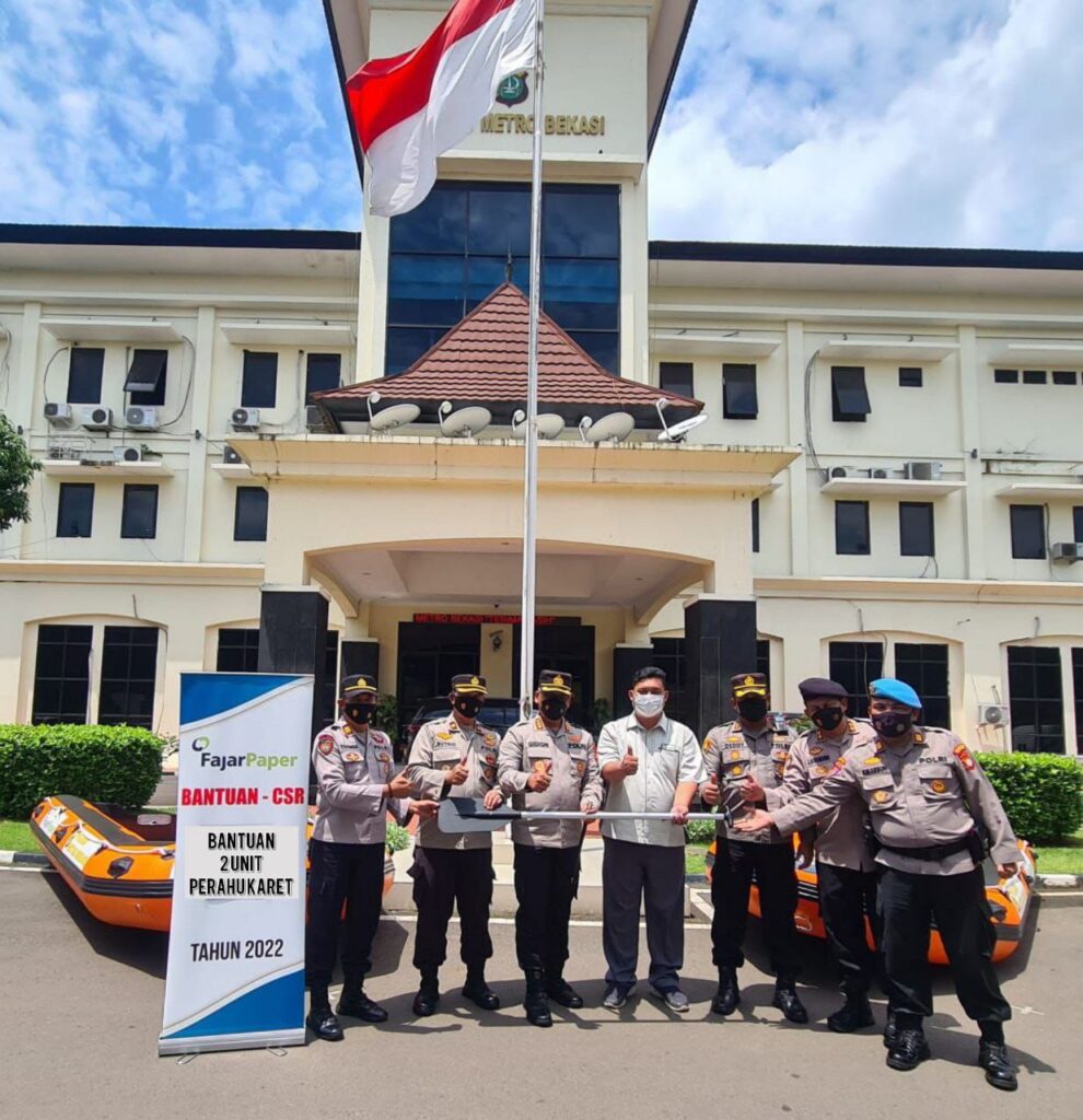 GUE JABAR | Kabupaten Bekasi – Bulan Februari tahun 2022 PT. Fajar Surya Wisesa Tbk. Atau yang lebih dikenal dengan FajarPaper mendistribusikan 2 unit perahu penyelamat lengkap dengan standart perlengkapan yang ada yaitu: 4 buah dayung, 15 meter tali tambang , pompa manual, peralatan perbaikan yang dimasukkan ke dalam tas peralatan di setiap perahunya. Penyerahan ini dilakukan oleh FajarPaper kepada Polres Metro Bekasi dengan tujuan mengantisipasi musim hujan yang masih berlangsung di bulan Februari ini, sehingga jika warga sekitar di wilayah Cikarang membutuhkan bantuan dan pertolongan yang menggunakan perahu penyelamat , maka Polres Metro Bekasi dapat dengan sigap melakukan tindakan pertolongan.