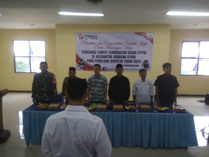 KABUPATEN BEKASI – Sebanyak 302 Pengawas Tempat Pemungutan Suara (PTPS) se-Kecamatan Cikarang Utara, Kabupaten Bekasi menjalani proses pelantikan anggota di kantor Kecamatan Cikarang Utara pada Minggu (03/11/2024).