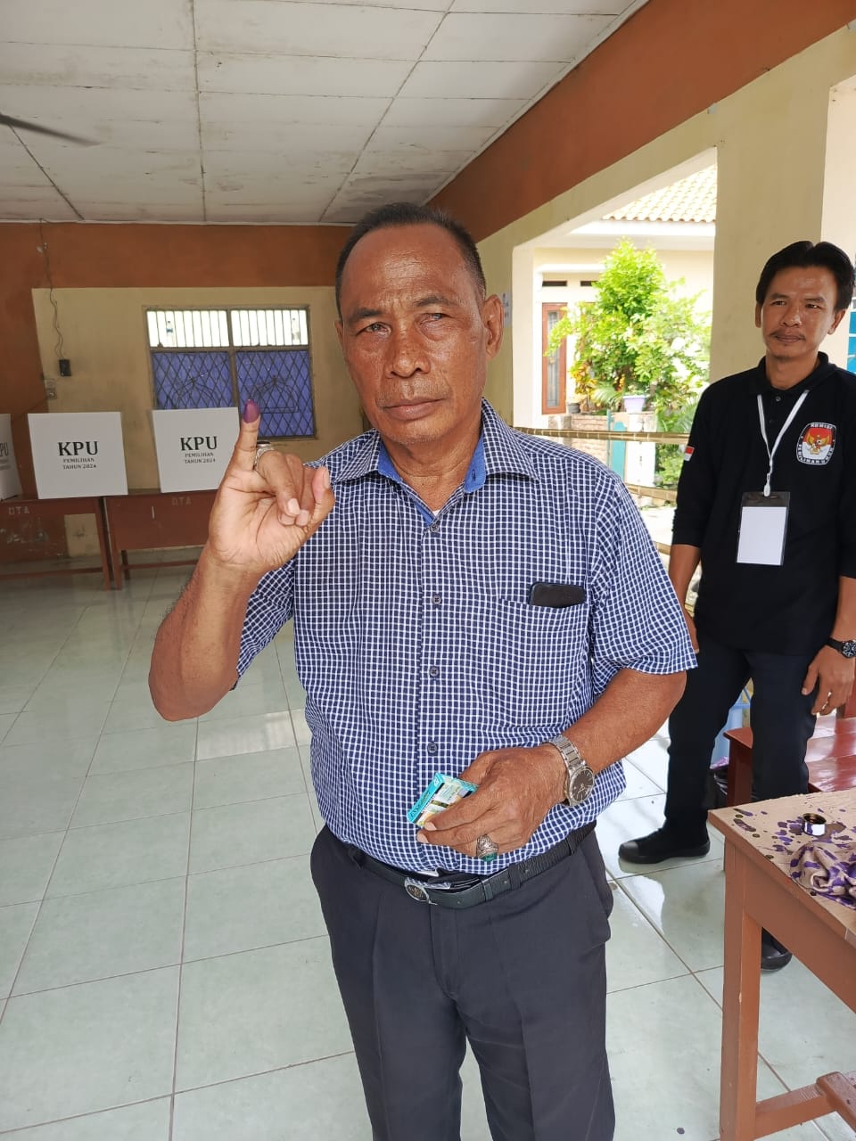 Tampak Kepala desa Karangsari yang akrab disapa Lurah Bao ini, sedang menunjukkan jari nya yang sudah diberi tinta sebagai bukti bahwa dirinya sudah melakukan pencoblosan di TPS.