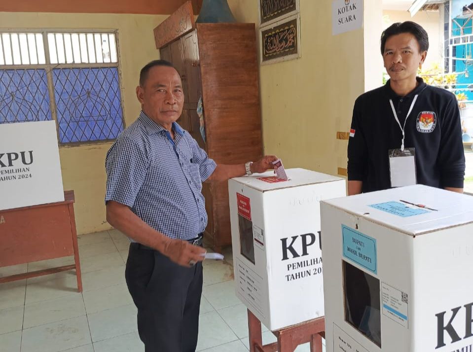 BEKASI – Kepala desa (Kades) Karangsari Umbara datang ke TPS untuk menggunakan hak pilihnya di Pilkada serentak 2024, di Desa Karangsari, Kecamatan Cikarang Timur, Kabupaten Bekasi, Rabu 27/11/2024.