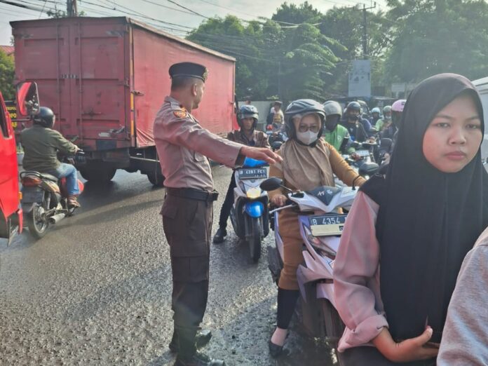 Sekitar 10 orang anggota Polsek Cikarang Utara turun langsung untuk membantu mengurai dari berbagai arah dan mengatur pengendara agar tertib lalu lintas.