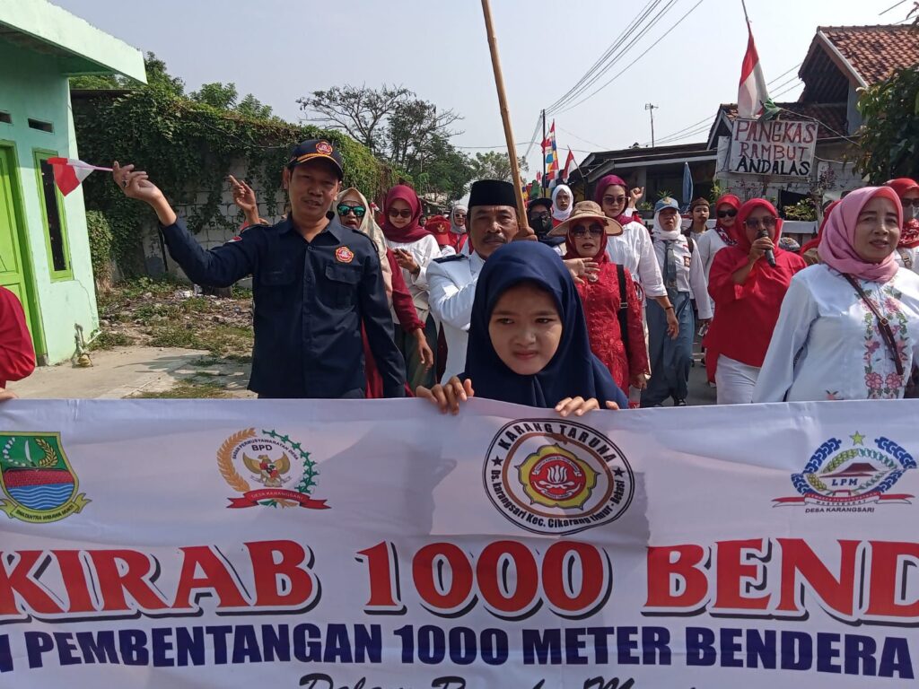 Kabupaten Bekasi – Semarak kemerdekaan bangsa Indonesia terus membakar semangat para pemuda di Indonesia, salah satunya Karang Taruna Karangsari yang sukses menggelar berbagai kegiatan salah satunya Kirab 1000 bendera dan Bentangkan Bendera sepanjang 1000 meter.