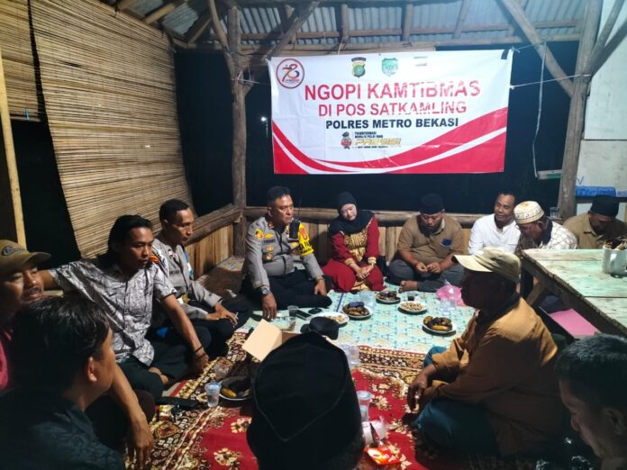 Kabupaten Bekasi – Kapolsek Kedungwaringin AKP Muhammad Trisno, SH.,MM laksanakan giat “Ngopi Kamtibmas” bersama tokoh masyarakat di poskamling Kp. Cebong RT 004/002 Desa Mekar Jaya, kecamatan Kedung Waringin, kabupaten Bekasi, Sabtu 11/10/2025.