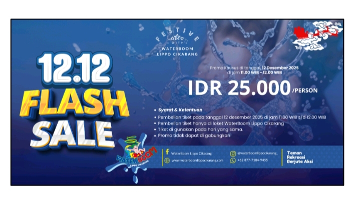 Promo 12.12 Flash Sale menawarkan tiket masuk dengan harga khusus Rp 25.000 per orang, yang hanya berlaku pada tanggal 12 Desember 2025. Pembelian tiket dapat dilakukan secara langsung di loket WaterBoom Lippo Cikarang pada pukul 11.00 hingga 12.00 WIB, dan tiket yang dibeli berlaku untuk digunakan pada hari yang sama. Kebijakan ini diterapkan untuk memastikan pelayanan tetap optimal serta menjaga kenyamanan pengunjung.