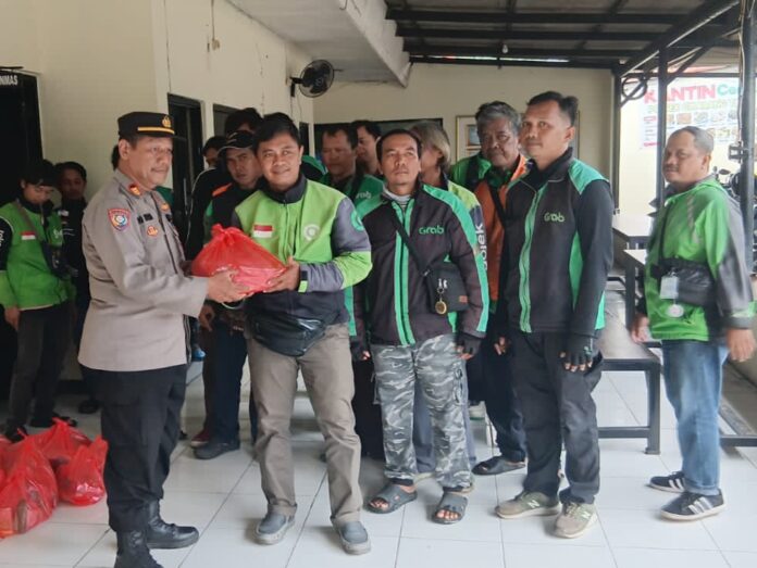 Polsek Cikarang Timur Bagi Paket Sembako Untuk Pengemudi Ojek Online dalam Program Jumat Berkah