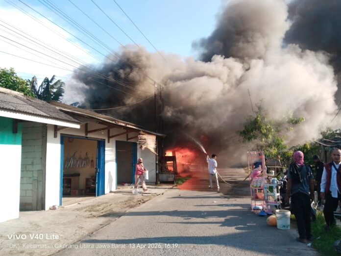 Bekasi – Sebuah bangunan yang merupakan tempat penggilingan padi di Kp. pisang batu RT 02/06 Karang Raharja, Kecamatan Cikarang Utara ludes dilalap si jago merah, Senin 13/04/2026.