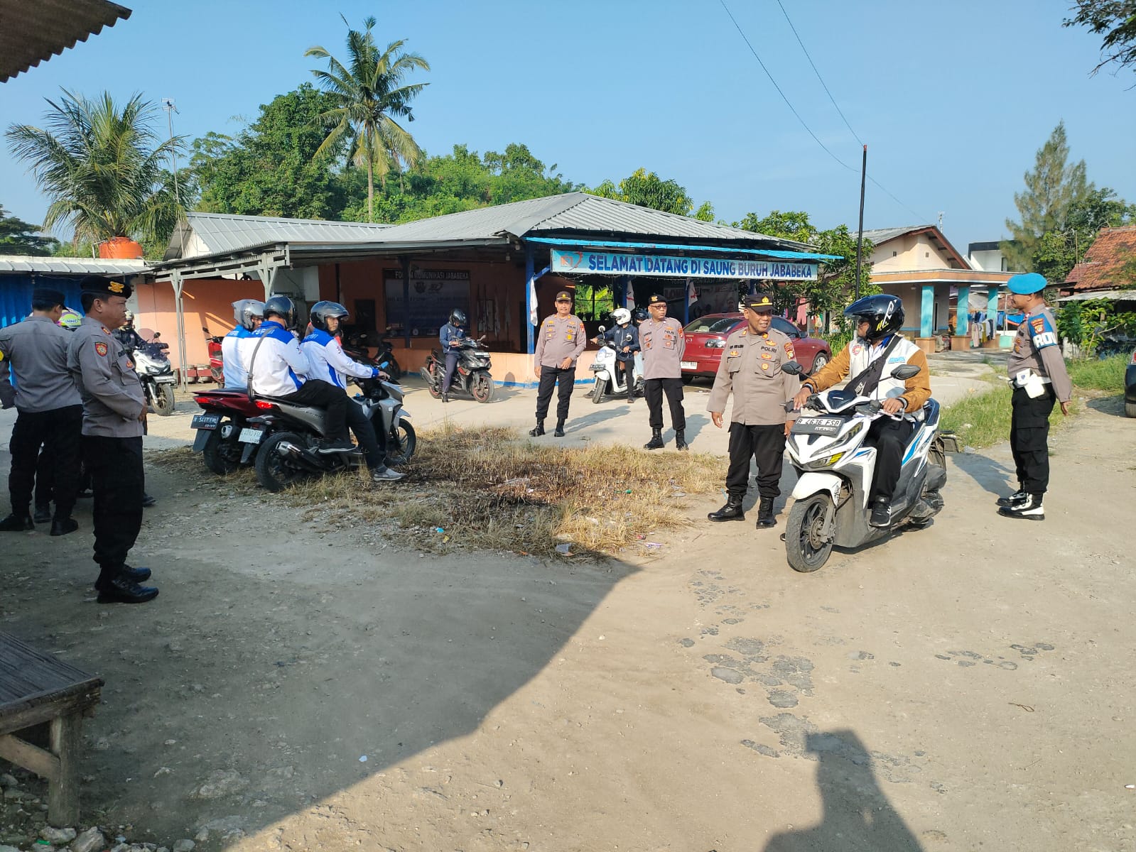 Personel gabungan dari Polsek Cikarang Timur dan Security Jababeka, yang dipimpin langsung oleh Wakapolsek AKP M. Jamaludin, disiagakan di titik kumpul Saung Buruh, Desa Jatireja.