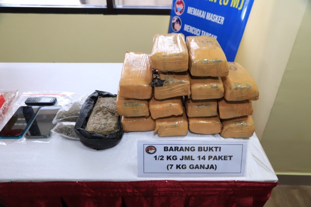 “Kita temukan barang bukti berupa 1 (satu) bungkus plastik hitam yang didalamnya terdapat Narkotika Jenis ganja dengan berat brutto 250 gram dan 2 buah plastik bening yang didalamnya berisikan narkotika jenis ganja dengan berat brutto 100 gram dan juga 1 (satu) unit Hp merk Nokia 1280 warna biru,” terangnya.