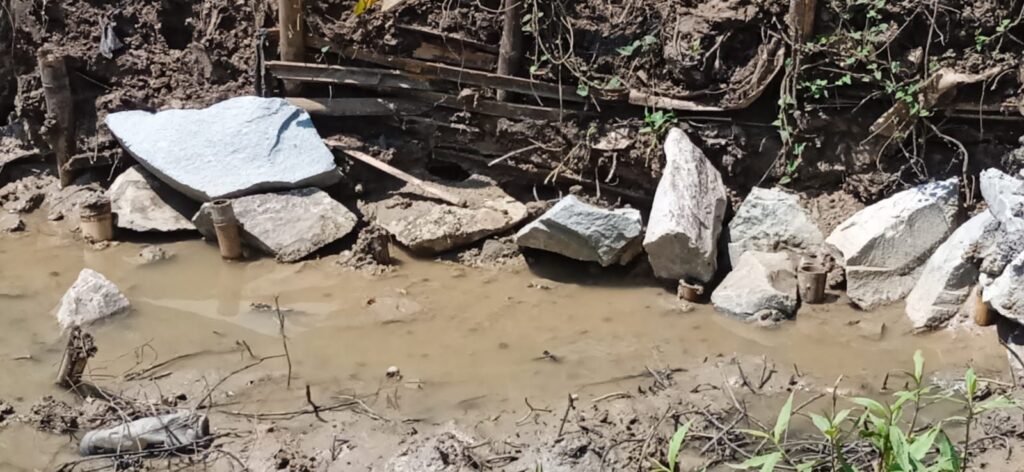 “Dalam pemasangan batu yang hanya dipendam dilumpur, tidak adanya sepatu sebagai pondasi hanya menggunakan cerucuk bambu, batu yang disusun juga tampak bertumpuk tanpa adukan sehingga adanya lubang atau space di susunan batu ditambah lagi pekerjaan dilakukan masih dalam keadaan penuh air tidak dilakukan pengeringan terlebih dahulu menambah keraguan dalam kekuatan pembangunan baik secara kualitas dan kuantitasnya,” papar Brian.